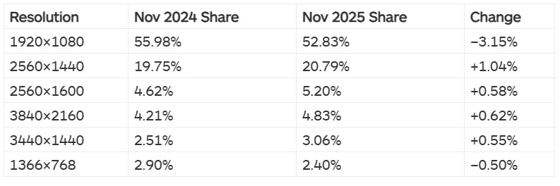 2025年11月Steam硬件调查显示,1080P分辨率以52.83%的占比稳居第一,尽管相比去年同期下降了3.15%,仍占据绝对优势。这表明大多数玩家在画质与性能之间更倾向于平衡选择,高刷新率1080P显示器依然是游戏市场的标配。