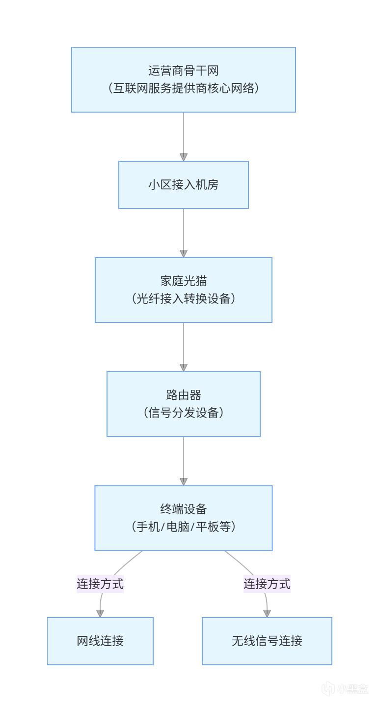 從宏觀到微觀,這條鏈路大概是這樣的:互聯網服務提供商也就是運營商的骨幹網,連接到你所在小區的接入機房,通過光纖進入你家裏的光貓,光貓再連接到路由器,路由器最後通過網線或者無線信號連接到你的手機、電腦或者平板設備。