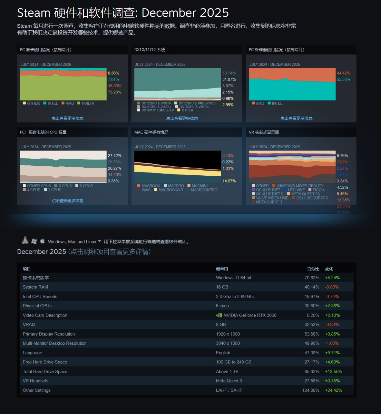Steam 12月的硬件調查報告現已公佈,下面是各項目中最常用的數據統計整理: