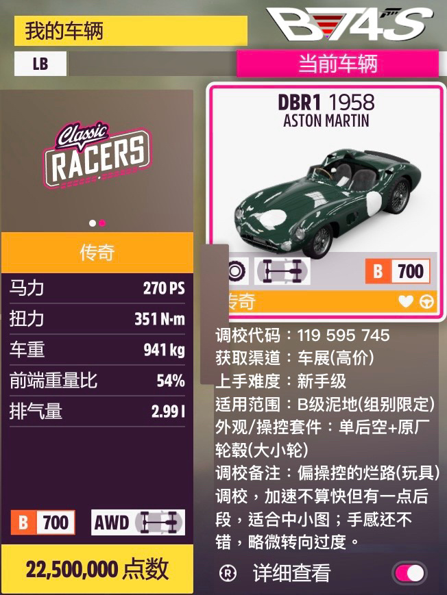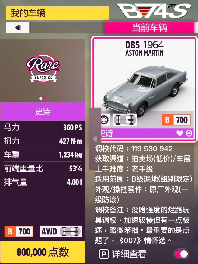 強度方面就推薦一輛Mini,別的倆阿斯頓馬丁都是偏娛樂的玩具車。Mini翻新調校,單後空手感更好強度也更高,雖然極速依舊不高但是憑藉前中段的加速能力還是能輕鬆脫穎而出的,前兩張圖的成績也不錯。針對前兩張圖保留了一定的靈活性,所以注意控方向不要太無腦地漂移而spin了。馬丁DBR1也算個人有點印象的車了,4代的時候就挺喜歡的,5代壓B級雖然不算很強但也不慢,底盤和操控相當不錯。手感可能會比mini更好,畢竟底子是老一輩跑車。標題“特工”顯然主要是指相當有代表性的經典電影車DB5了,《007》系列還是有一定知名度的,這輛DB5個人也挺喜歡的,所以雖然強度較低也還是放出來了。完全的原廠外觀,沒加空力加速卻也比較慢,手感還行但長車身略顯笨拙,就純玩具了。本來調校標題想取成No Time To Die的,但是die不合規發不出去,只能改成普通的了。