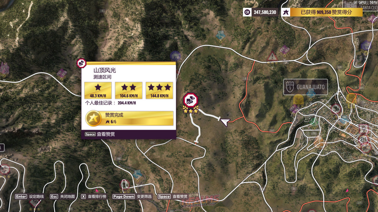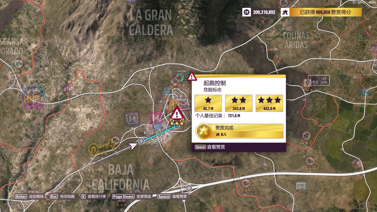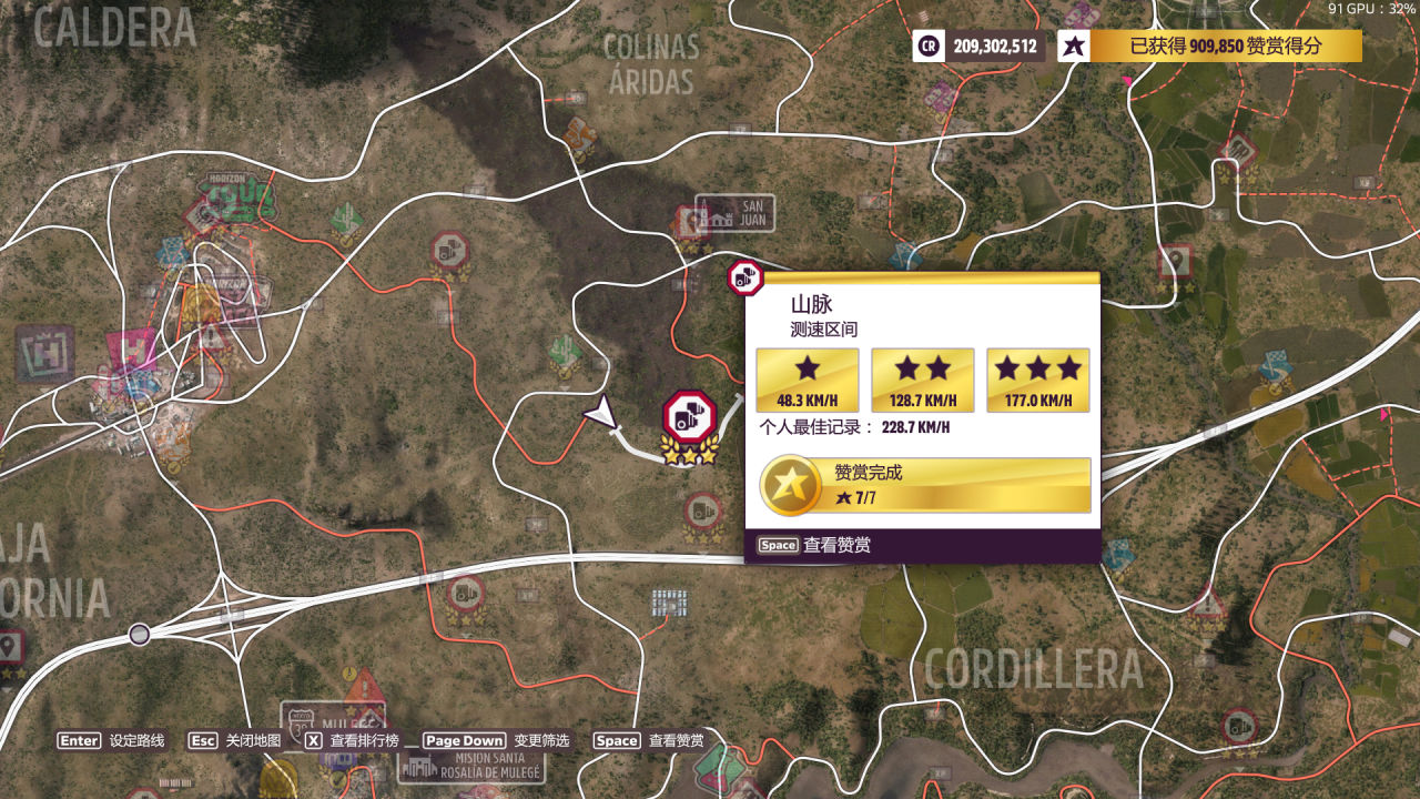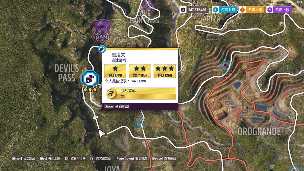 第二關要求升級到B級或以上(看老賽季的反饋改到A級好像有概率不算數,所以就放B了)在任意測速區間累計達成3星,推薦選下圖的“攀登之路”或“山脈”,都是難度不大的泥地測速。雖然是B級直線胎偏直線的調校,在爛路上開起來卻意外地合適,可能原理和另一輛三輪Reliant差不多。當然過彎還是比較困難的,注意控油控方向,只要不衝出限制應該都能穩定2星,跑兩次就行。對了輔助方面建議把“牽引力控制”打開。