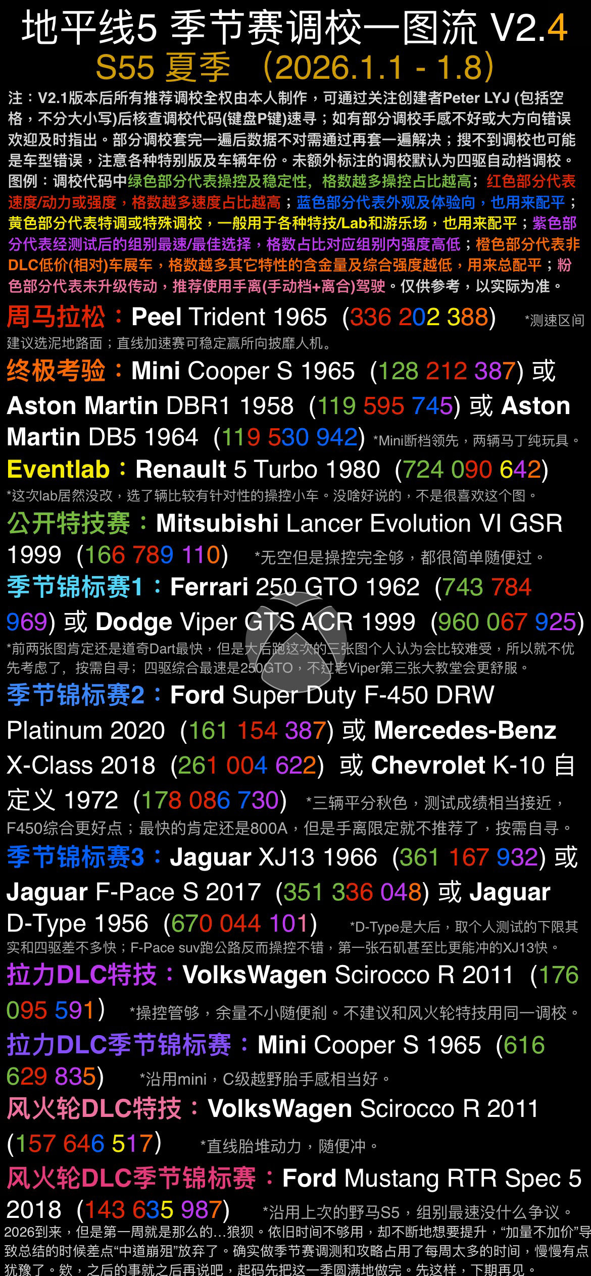 其實跨年夜沒時間享受也問題不大的,但是熬了半天沒做完還差點放棄就有點難受了。之後考慮給自己“減負”吧,少做點測試減少時間浪費(比如這次錦標賽3的I-Pace調了半天結果也端不出來)。每週調測+做攻略花個40多小時還是有點太累了,雖然結果是好的,但是這次已經有點撐不住了。然後這周還有個原因是官方預告拖到週四才發,lab啥的又不太確定,搞得我也沒啥提前做完的動力。