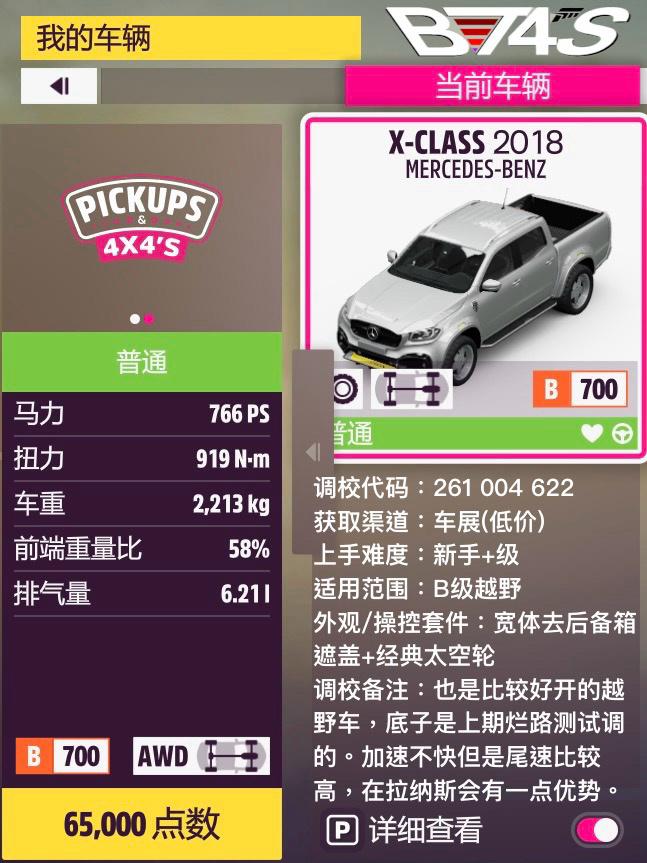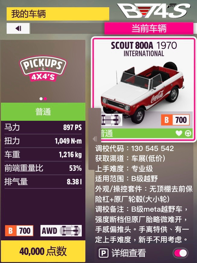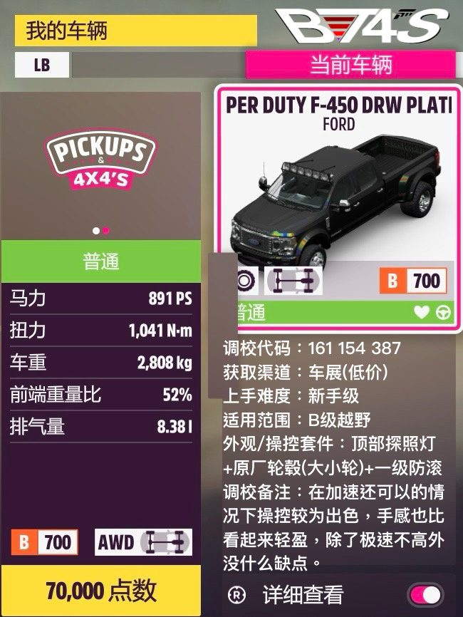 最快的肯定還是800A,不過手離限定+不算好開就不優先推薦了,調校放的是Fuzzy的。其他三輛都新調了自動檔調校,虧的性能分都沒那麼多,算在可接受範圍內;成績差距很小,各有千秋。F450的額外操控優勢使得它成爲綜合上的最佳選擇,而且車夠沉對抗性也強;X卡雖然加速不快但極速高也比較穩重,還算說得過去;K10在一衆皮卡里面算是小而靈活了,手離調校的上限應該是三輛裏最高的,不過算上自動虧分就還是五五開了。