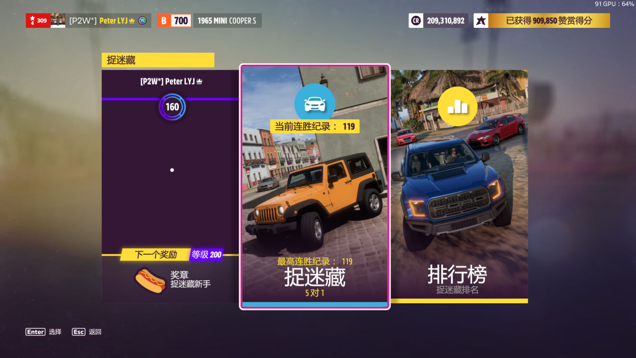 在捉迷藏遊戲中達成5次極速技術。儘量維持高速行駛,作爲“搜索者”會更簡單一點,找空曠的地方飆極速。個人推薦選車爲蘭博基尼Gallardo Spyder(搜索者)及福特F-150(躲藏者)。