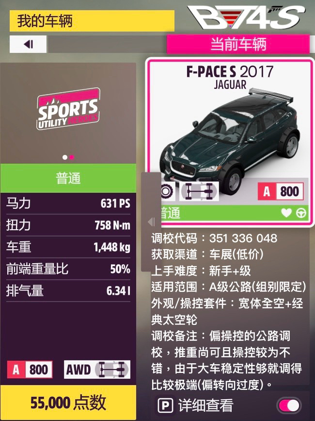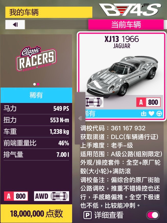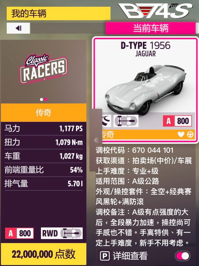 捷豹的幾輛正常現代跑車都沒什麼強度可言,SUV反而是不錯的選擇——F-Pace寬體下操控相當不錯,也有一定的推重,後段的劣勢也能靠大車的對抗性彌補(?),跑第一張石磯比較快。I-Pace雖然在錦標賽不會被ban但50分的性能分優勢也沒什麼用,手感不算好、成績還不如F-Pace,調了半天白忙活。終極版送的XJ13更能衝一點,原廠街胎配上還算不錯的空力,操控是夠的,推重與極速也比較高,在後面兩張圖會比F-Pace快不少。當然上限最高的還要數大後D-Type了,這次也做了個不一定好用的測試調校,畢竟之前沒有過開大後的經歷,不確定調得怎麼樣。車的底子還是不錯的,加速很快也比較能拐,穩定性也還行,只是綜合沒別的meta那麼強。