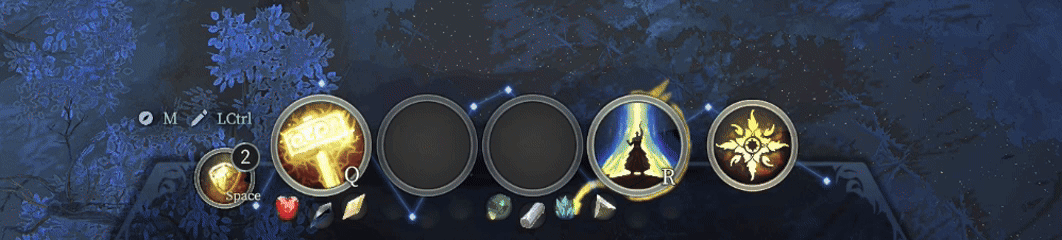 在局内玩家能够自由的调整四个技能,组成一套专属构筑,并且在QWER四个主动技能栏位下还能够进行三个空位的“宝石镶嵌”。