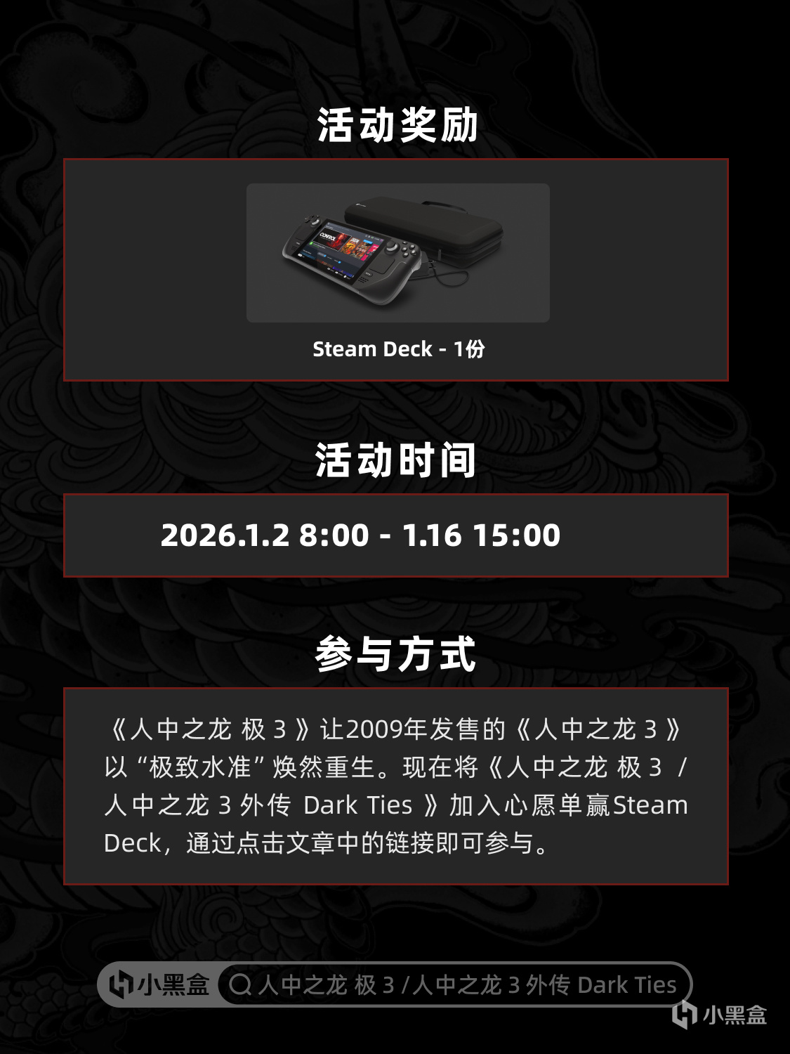現在將《人中之龍 極3 / 人中之龍3外傳 Dark Ties 》加入心願單贏Steam Deck,通過點擊文章中的鏈接即可參與。https://api.xiaoheihe.cn/store/roll_room_v2?award_id=5623