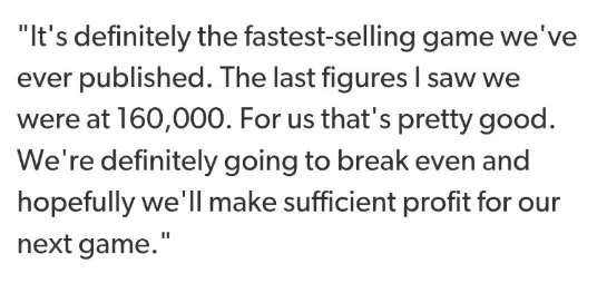 “這絕對是拉瑞安首發銷量最高的遊戲,根據最新數據,我們的銷量已達到160,000份。對我們來說,這成績相當不錯。已經達到收支平衡,並且有望爲下一款遊戲賺取足夠的利潤。”