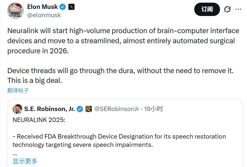 2025年12月31日,马斯克在社交媒体上宣布了他的脑机接口公司Neuralink的大计划。
