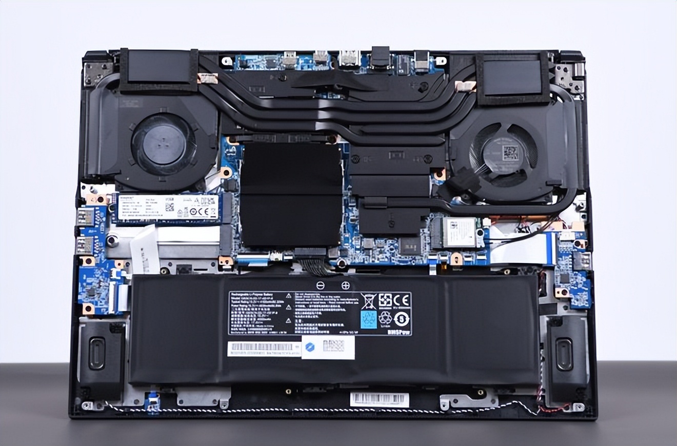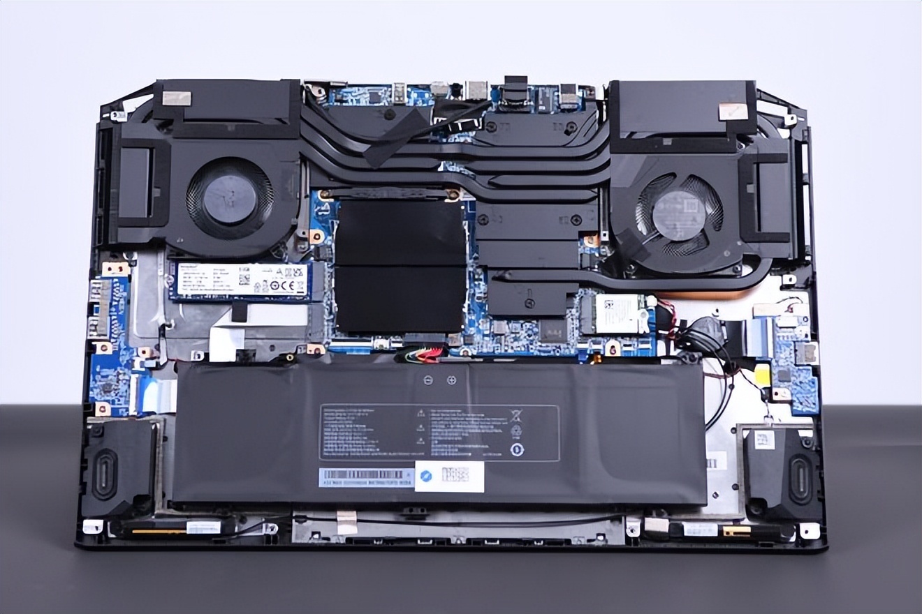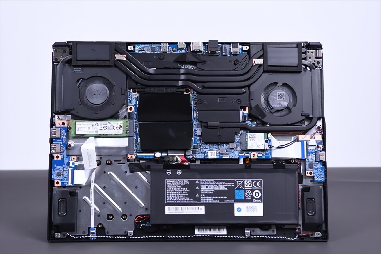 拆开D壳,本人惊讶的发现竟然lntel和AMD产品的内部布局几乎相同,只不过CPU和内存规格不一样。极光Pro、蛟龙15K、蛟龙16K和旷世G16散热模组都是5热管2风扇4出风口,巨大的均热板覆盖GPU、显存及供电,足以支撑140W RTX4060的满功耗释放。电池部分,蛟龙16K为62Wh 4芯、其余3款是46Wh 3芯,本人认为电池对于游戏本来说仅充当UPS的作用,大点小点无所谓。