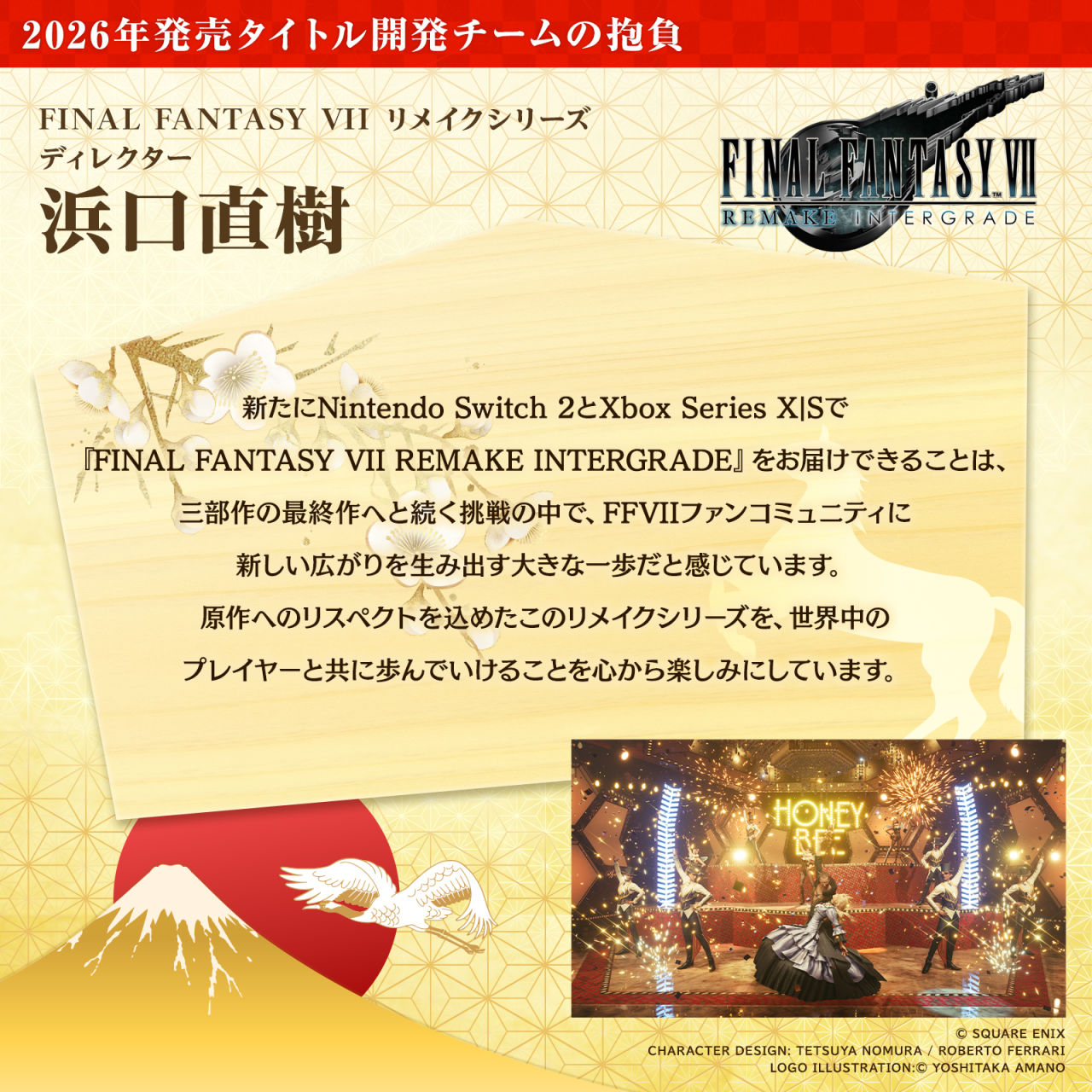 浜口在致辞中强调将《最终幻想7重制版 Intergrade》推向新平台的重要意义,称此举对系列及持续关注重制计划的玩家社区具有突破性进展。他表示:"能为Switch2与Xbox Series X|S平台带来《FF7重制版 Intergrade》,是向前迈进的关键一步。这将拓展FF7粉丝圈层,为我们迈向三部曲终章注入新动力。"