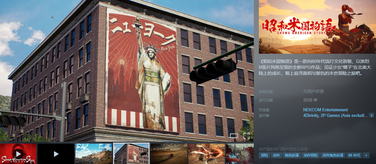 一个中国制作组制作的日本殖民美国的“乐子游戏”,没有一点史料全是刻板印象。想法很大胆,三个国的人都从其中获得了乐子。这种题材上不会有太大的雷点,游戏也没有什么技术上的超前量,质量应该不会存在太大的问题。预计今年第四季度发售,乐子人最喜欢的游戏。