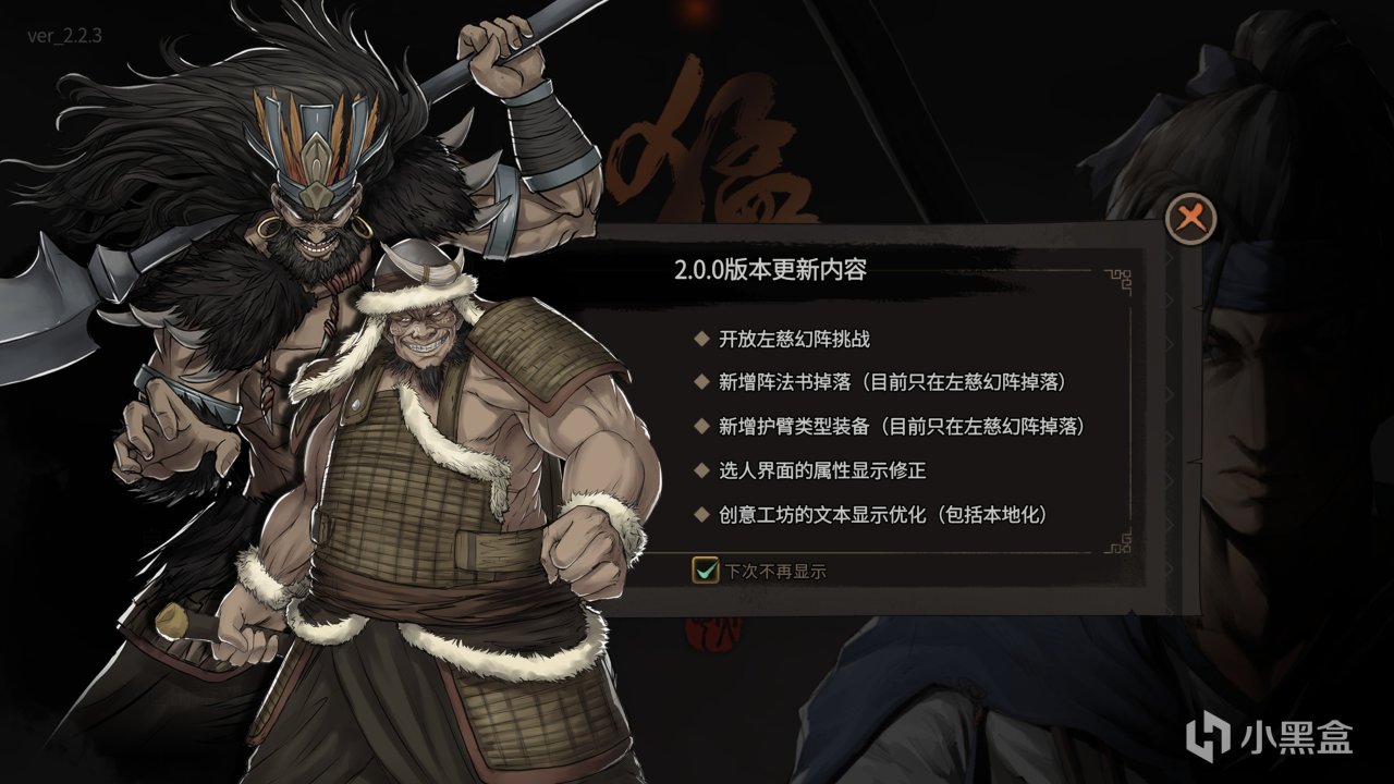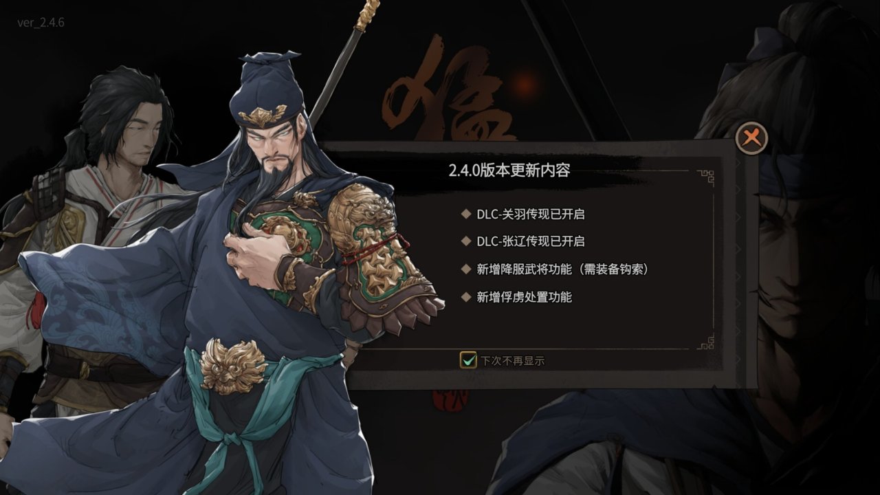 进入游戏,一则2.0版本更新速递便映入眼帘,这次的更新免费给玩家带来了两款DLC以及全新的降服武将玩法,另外还有新的掉落等待着玩家去探索~