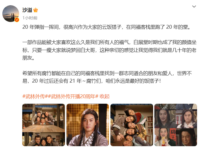 这场庆祝热潮的背后,是《武林外传》二十年未减的生命力。两个月前的剧组重聚舞台上,背后大屏依旧是熟悉的同福客栈陈设,范明一句“为了一方百姓,吃再多的苦我都不在乎”,让黑西装仿佛变成了邢捕头的新工服;