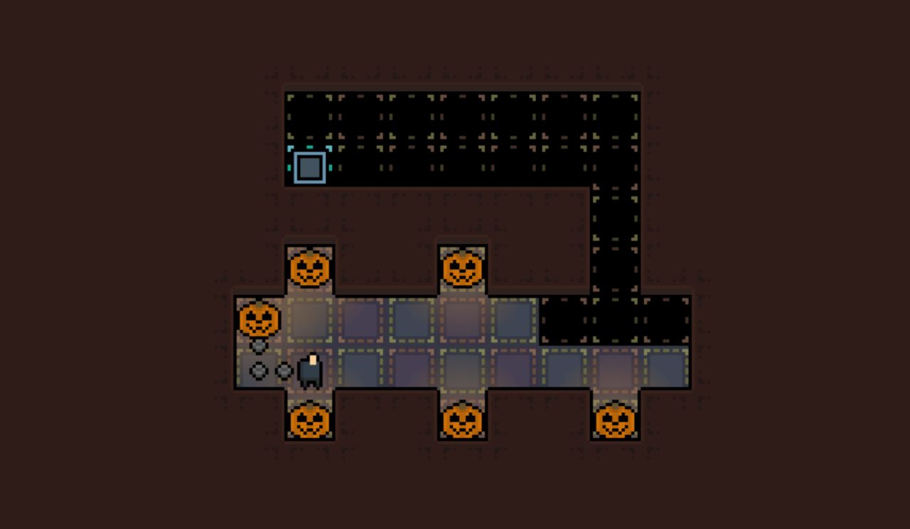 而本作继承了这一核心机制,还增加了一个新的核心机制,或者说核心设定:在关卡中充满了危险的“黑暗”,主角走入其中会直接死亡。但主角也可以用“光源”驱散黑暗,这个光源就是很有万圣节风格的“南瓜灯”。更加神奇的是,南瓜灯直接代替了原本规则集中的“铁球”,也就是说,现在主角的脚镣上绑着的不是一个铁球,而是一个南瓜灯。
