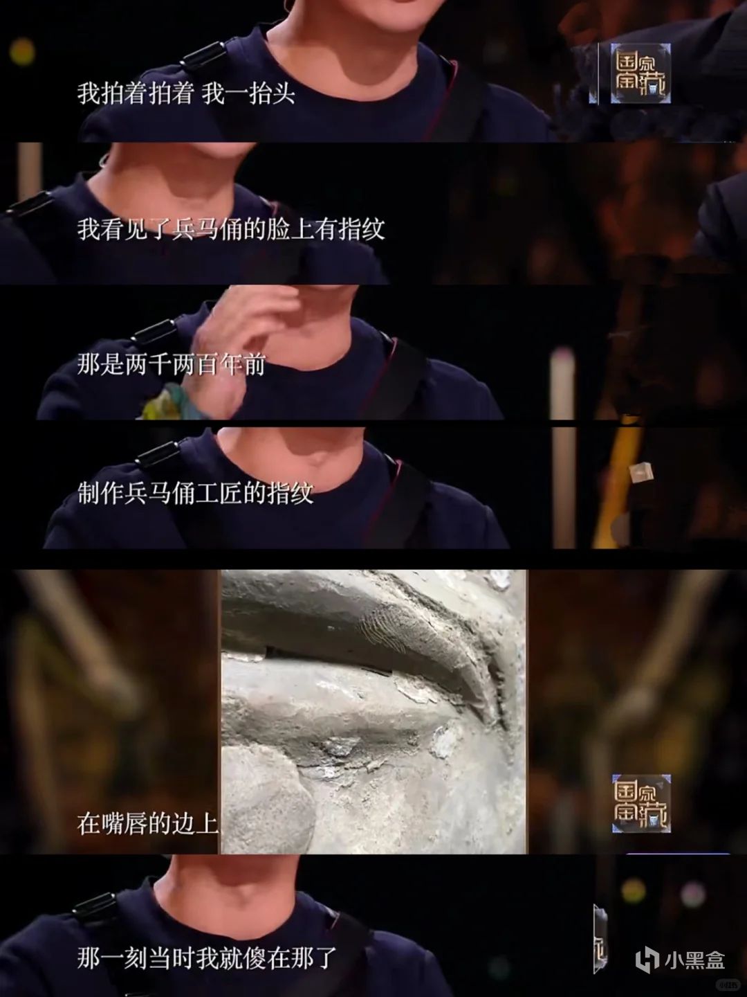 2020年《国家宝藏》节目中提及,考古或文物保护工作者在对兵马俑进行修复、研究时,于某件兵马俑的嘴唇边缘发现了留存 2200 余年的古代工匠指纹,