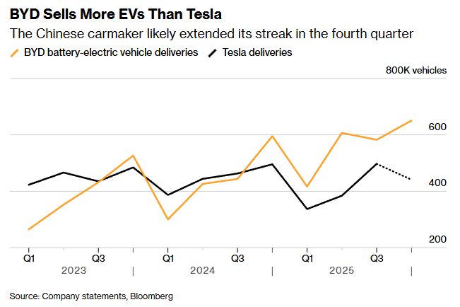 2026年伊始,全球新能源汽车行业的王座正式易主。根据最新发布的销量数据,中国汽车制造商比亚迪在2025年全年纯电动汽车交付量上首次超越美国特斯拉,成为新的全球销量冠军。
