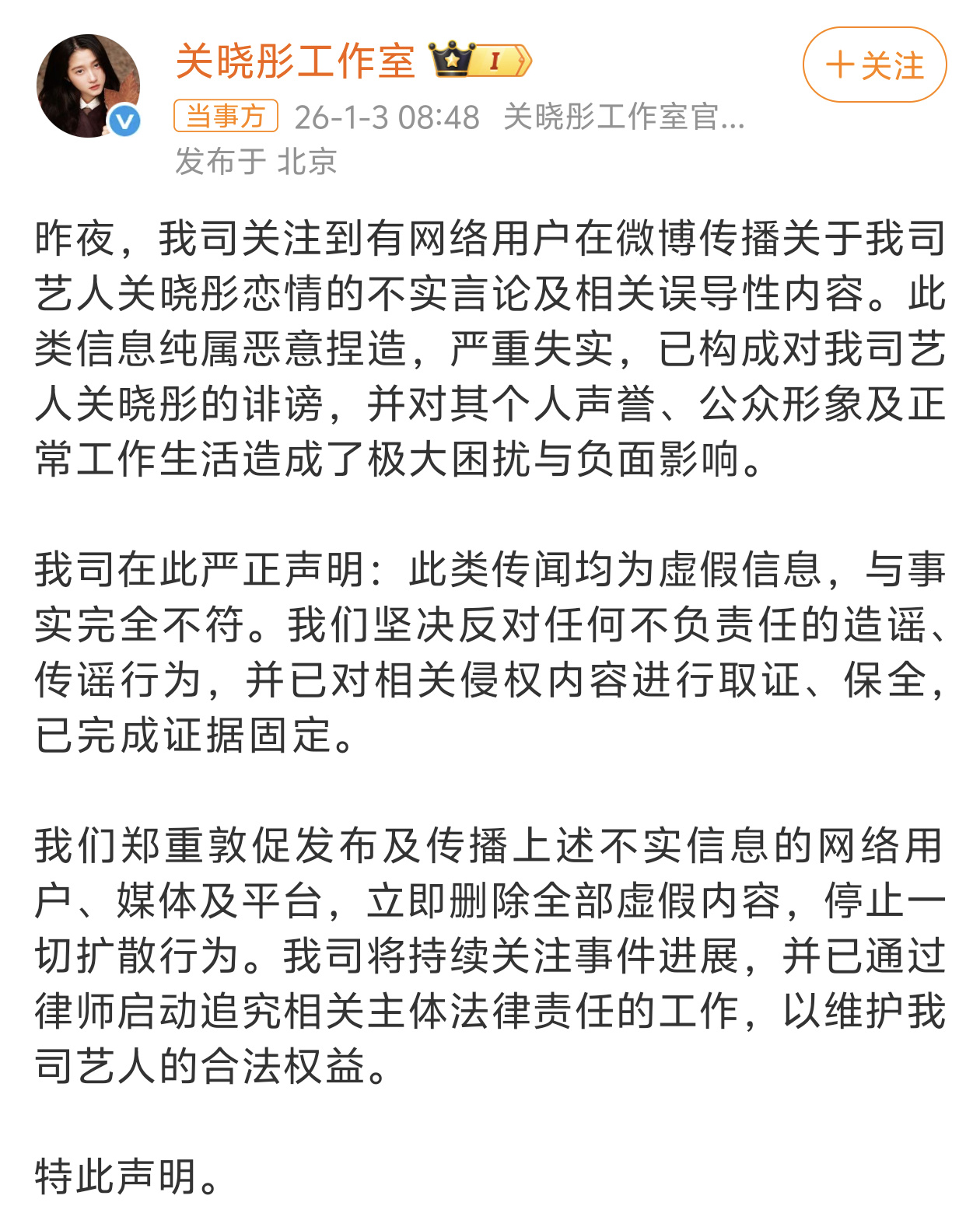 2026年1月3日8时48分,关晓彤工作室通过官方微博发布严正声明,针对网传关晓彤恋情的不实言论作出回应。