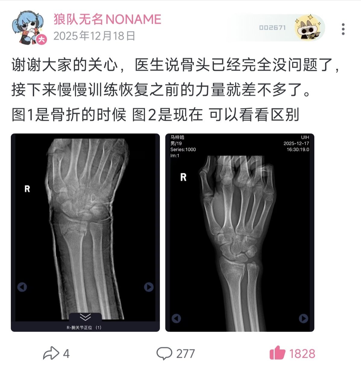 12月18日,无名发布动态称手伤恢复良好,“接下来慢慢恢复训练之前的力量就差不多了”。