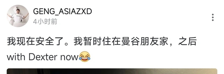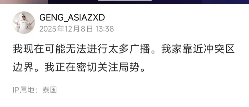 12月8日,泰国职业选手Asia称因家靠近冲突区边界需要暂缓直播。