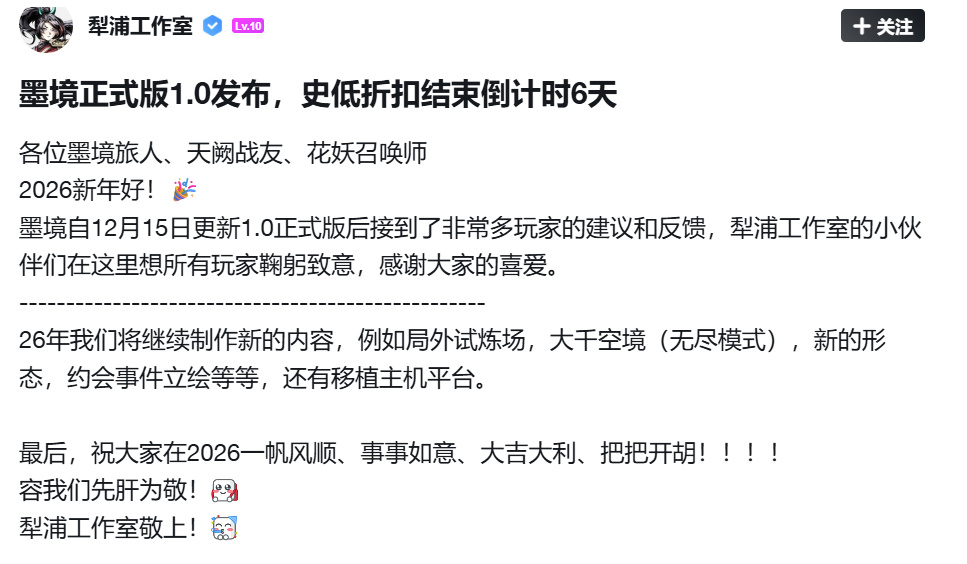 玩家真金白银支持,制作组不断爆肝更新。国产EA并不是Debuff,也不应该与爆雷、跑路和摆烂画等号。如果能够按期、足量更新下去,《墨境》和支持的玩家会成就一段佳话。不出意外的话就要出意外了,由于发行商的缘故,《墨境》惨遭下架。