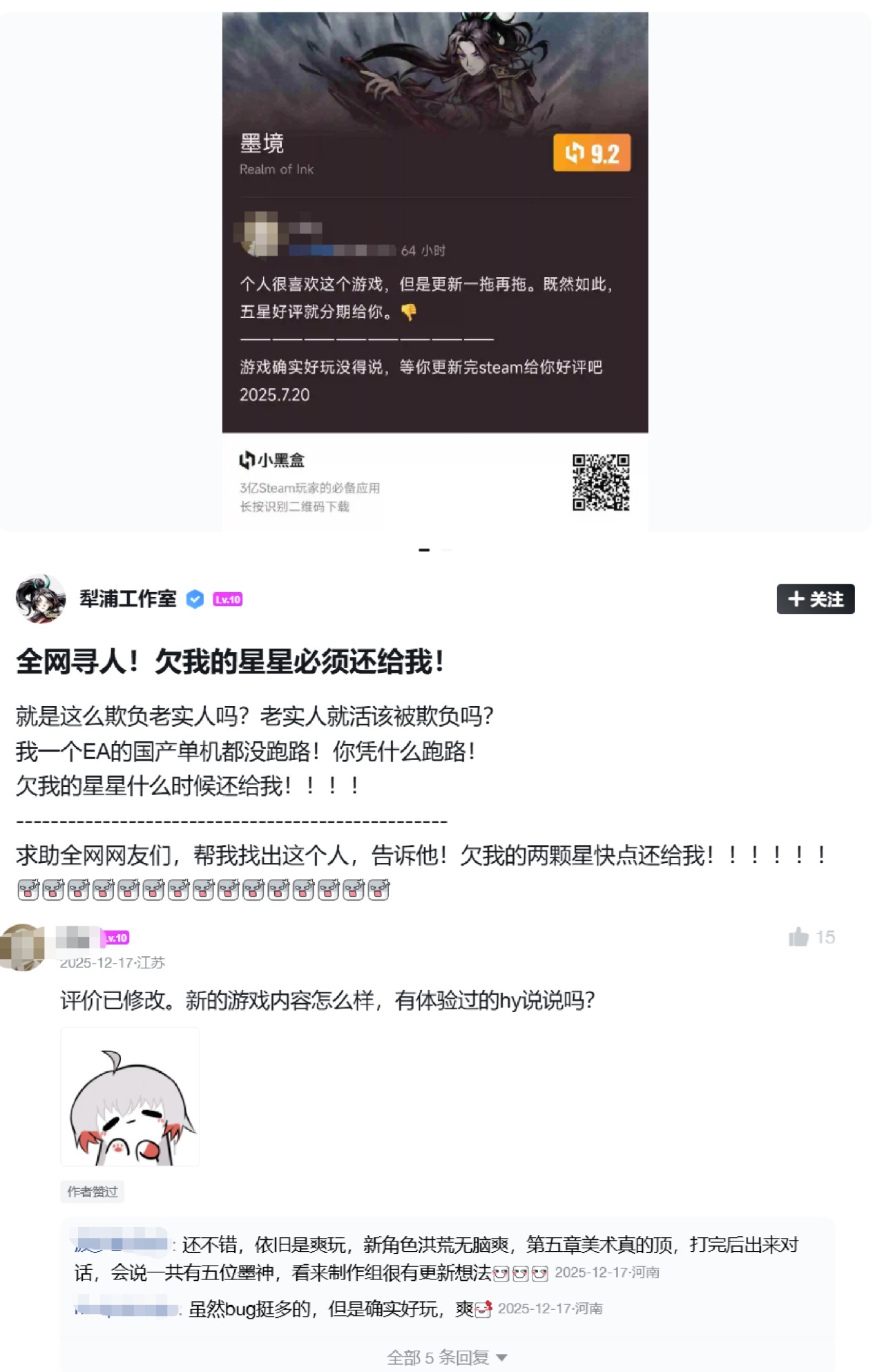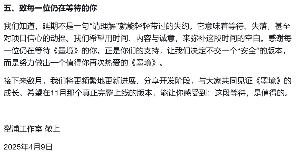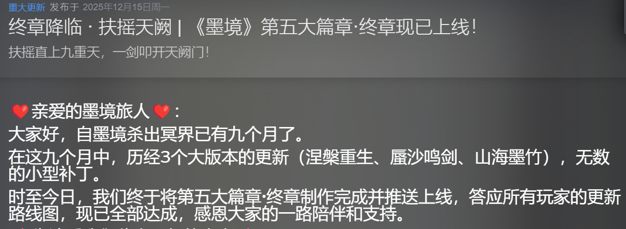 在恢复上架9个月后,《墨境》终于在2025年12月迎来了五大篇章·终章内容的上线。那位因为跳票而扣两星的那名盒友,《墨境》更新完了,又可以下回来继续肝了。后续:这名盒友已经改回5星好评,游玩时长从64小时增长到了81小时。