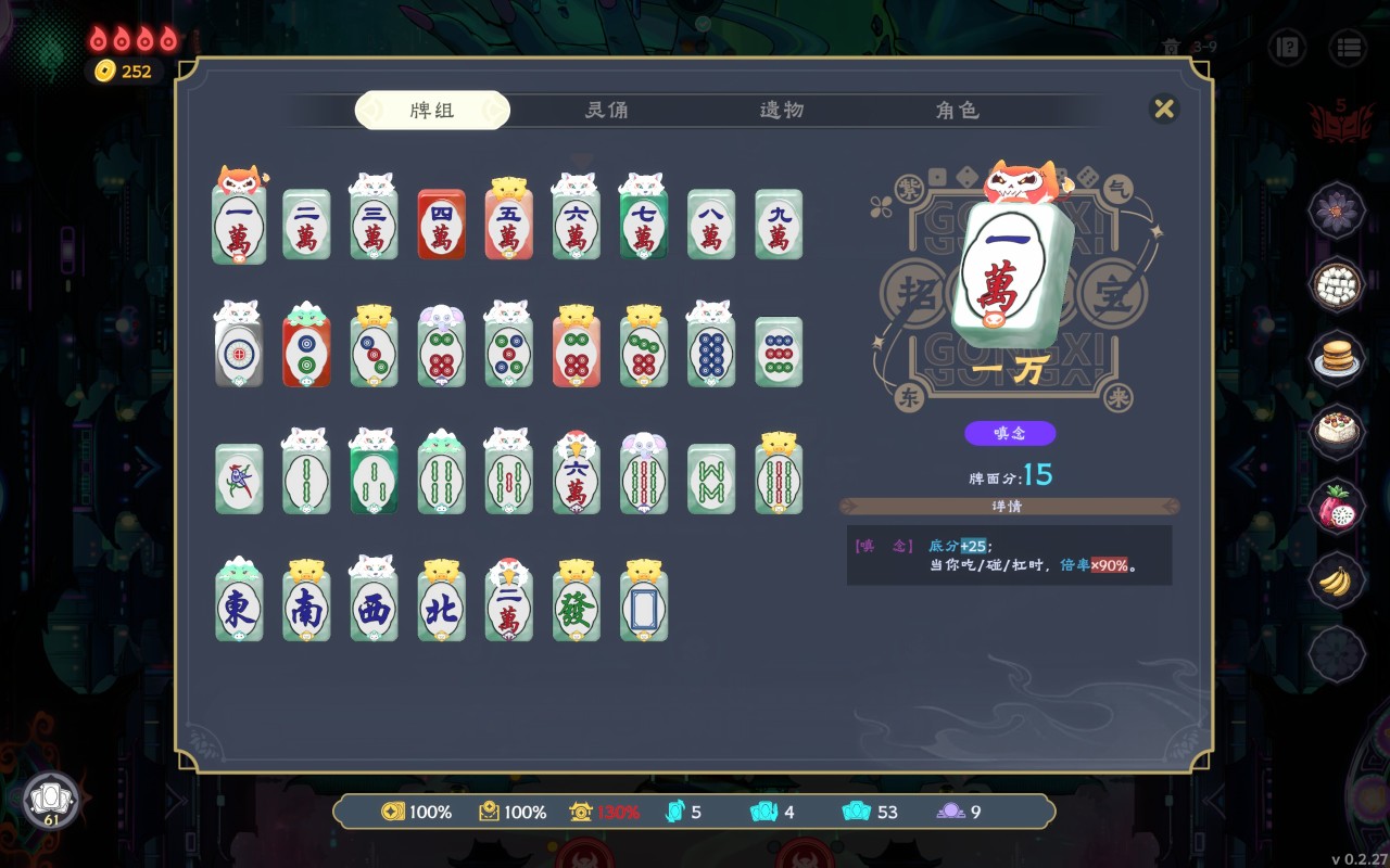 配合上各種遺物和可消耗祭品,能夠打出不一樣的組合和一些平常打麻將打不出來的非常誇張的牌型。也能構築充滿各種靈物的牌組。