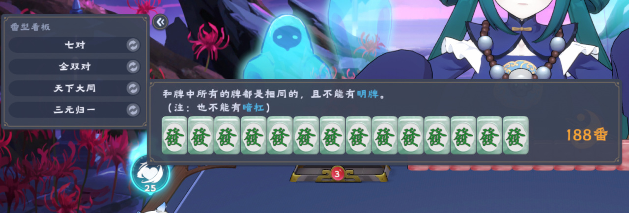 每個角色都有技能,比如馬面的技能就是當場印牌,打造七對或者天下大同的牌型。不算道具加成足足188番。