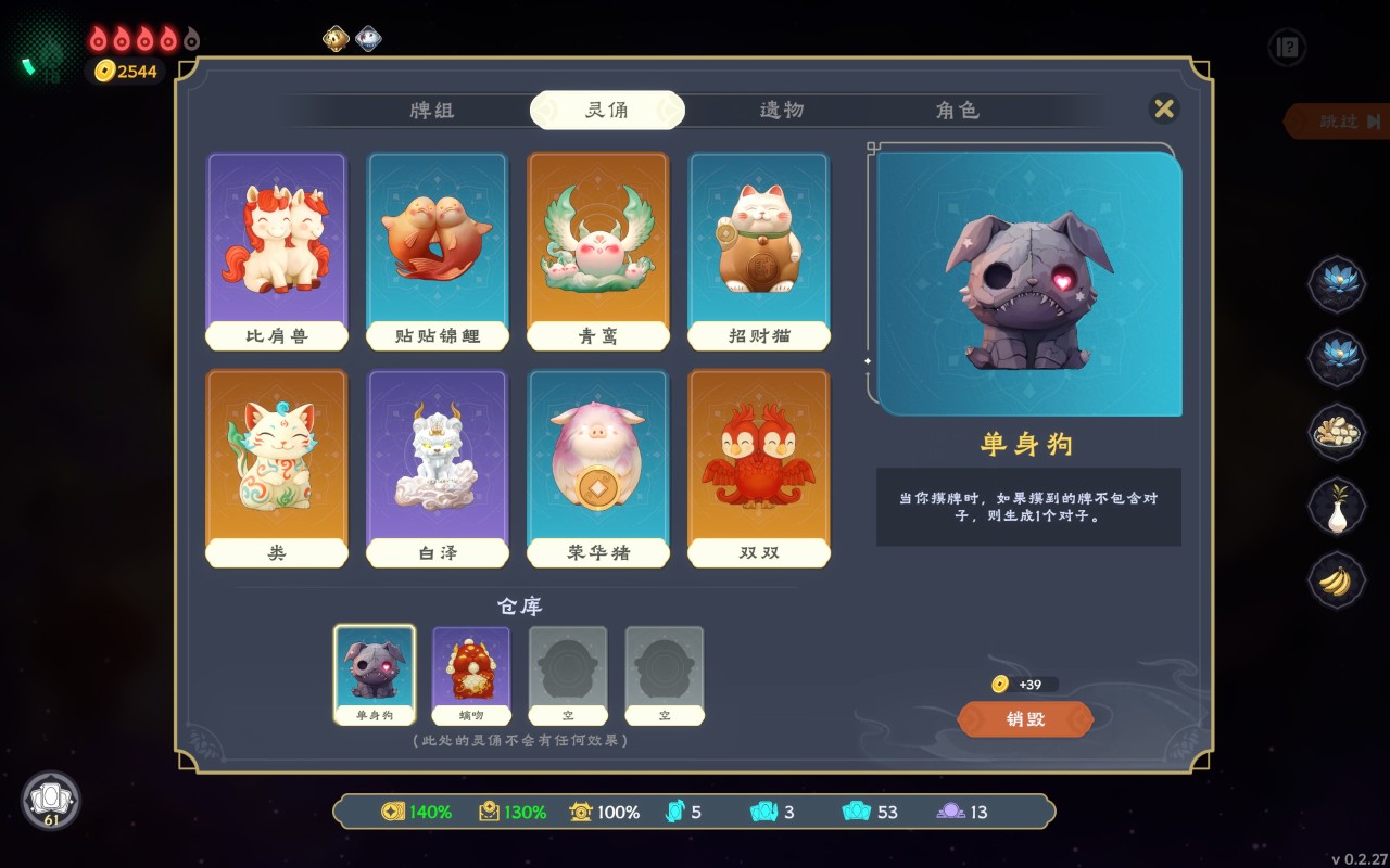 這遊戲的核心是 “靈俑系統”,相當於《小丑牌》裏的小丑牌(靈俑相當強力),單局永久生效但佔槽位,得隨時換着搭配合成最適合你的Build(構築)。