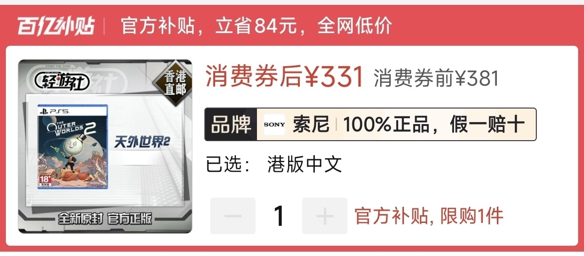 本周史低321元(v3券),没有v3可以333元(消费券),史低321元(消费券)