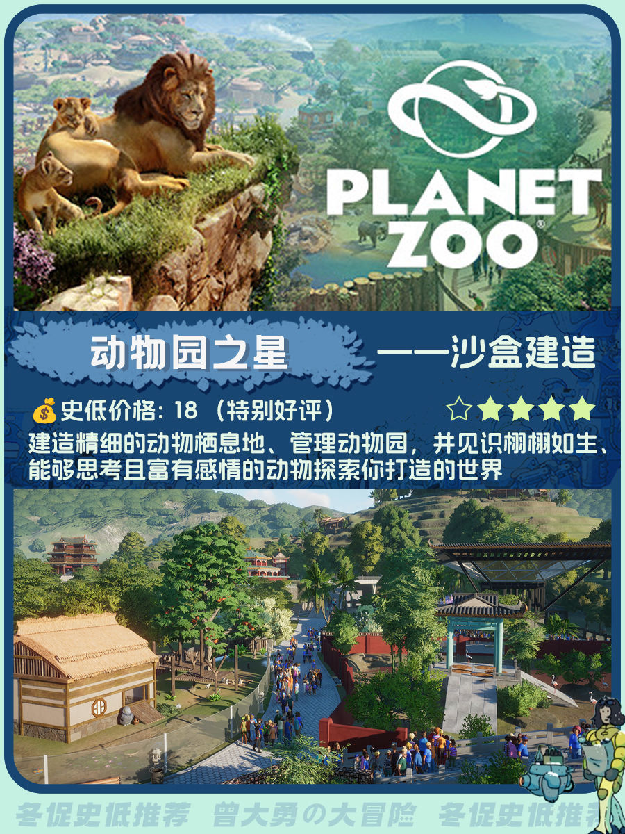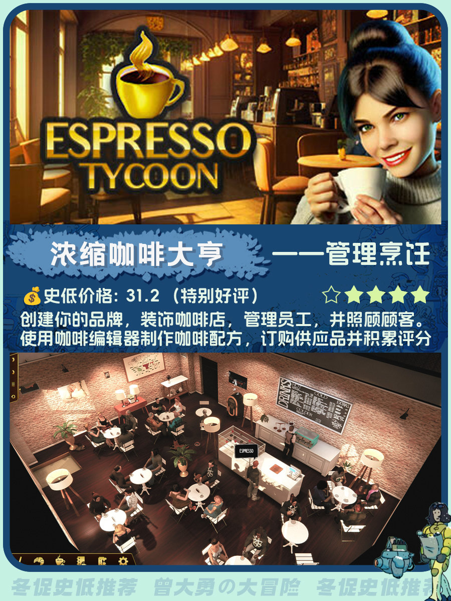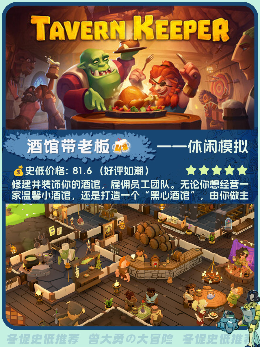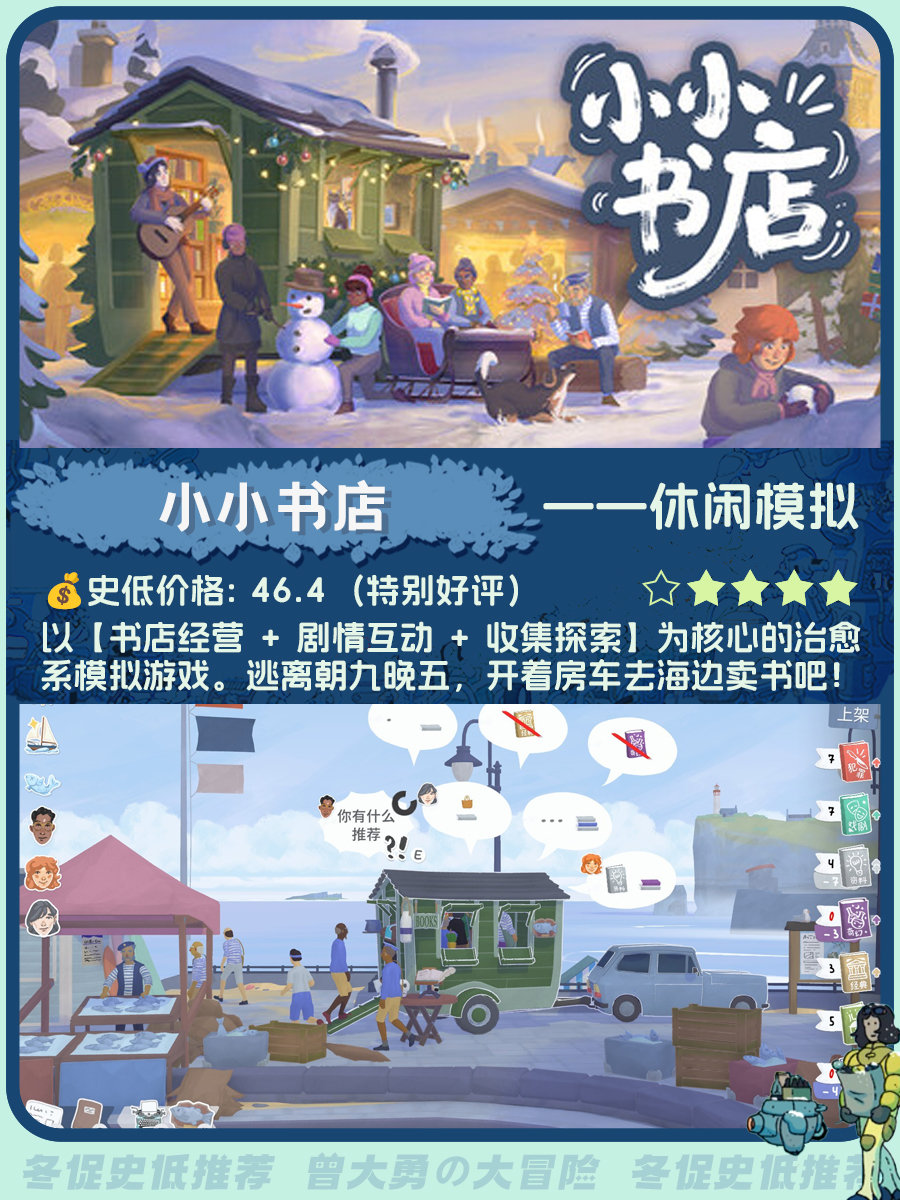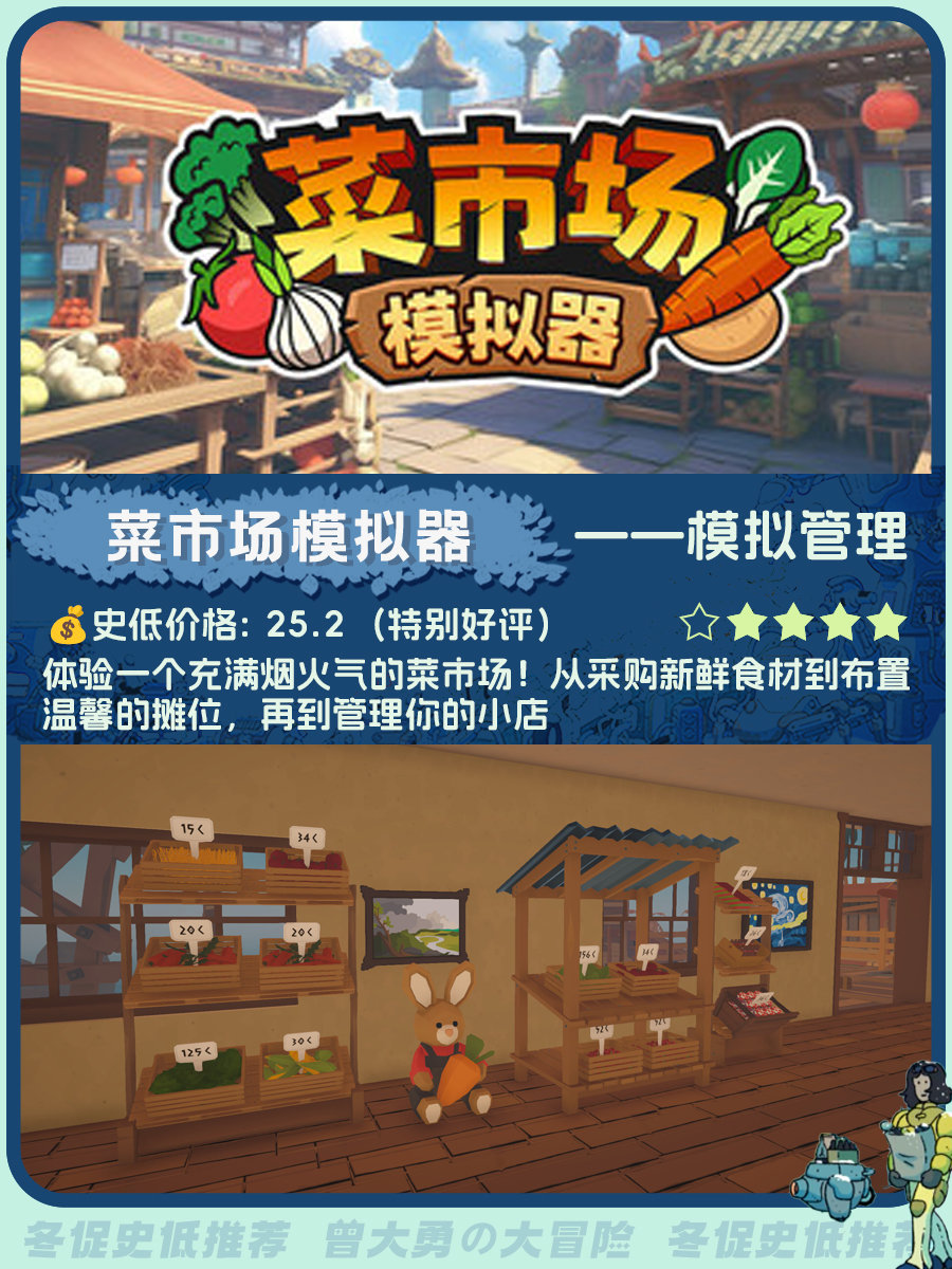 整理了一份冬促打折的模拟经营游戏。图里包含史低价格、玩家评分、游戏概述(星级是根据好评度给出)一期十二款