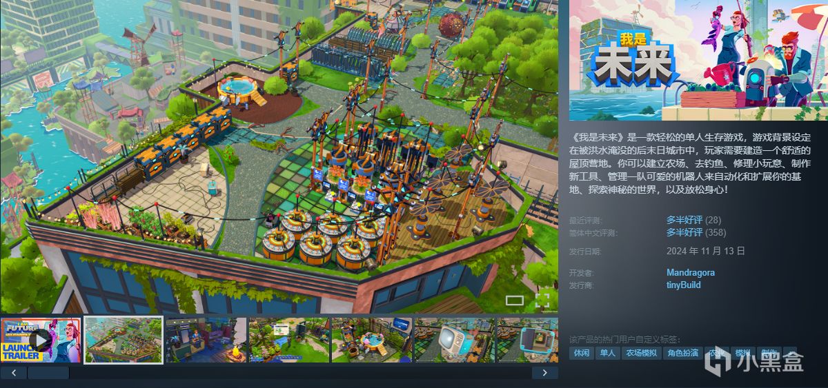 《我是未来》是一款轻松的单人生存游戏,游戏背景设定在被洪水淹没的后末日城市中,玩家需要建造一个舒适的屋顶营地。你可以建立农场、去钓鱼、修理小玩意、制作新工具、管理一队可爱的机器人来自动化和扩展你的基地、探索神秘的世界,以及放松身心!