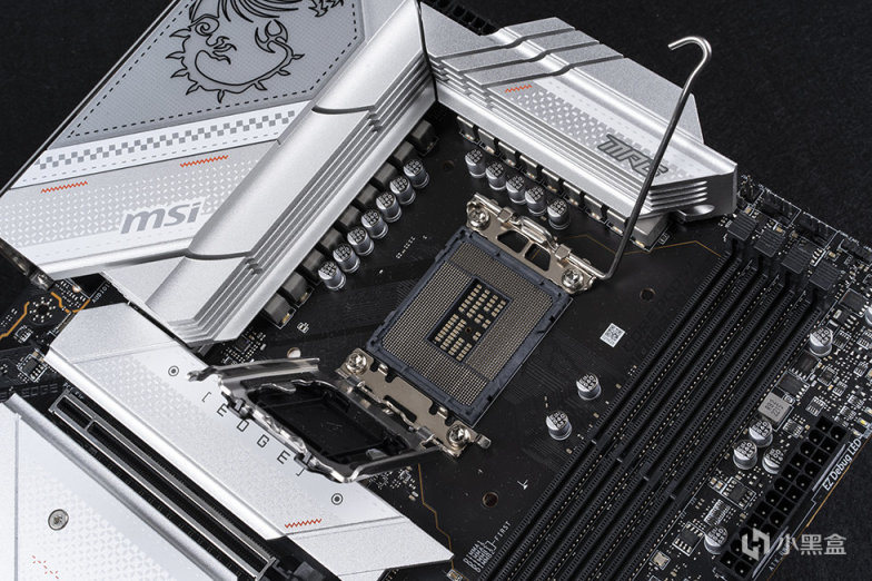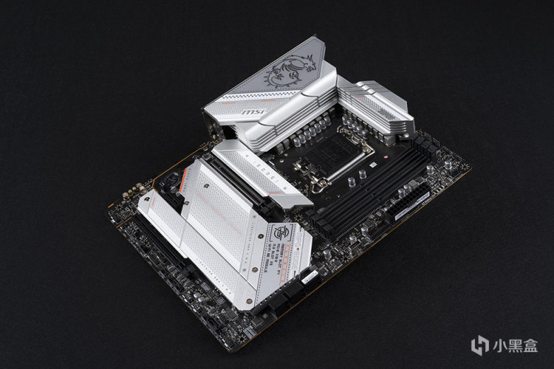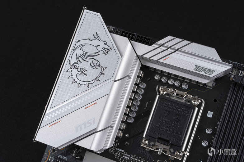 微星MPG Z790 EDGE WIFI DDR4 主板的VRM散热装甲两个超大的金属散热鳍片通过铜管链接,并在MOS管上方也配备了7W/mK的高效导热垫。VRM的上的龙形LOGO支持ARGB和主板同步灯效。