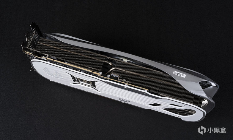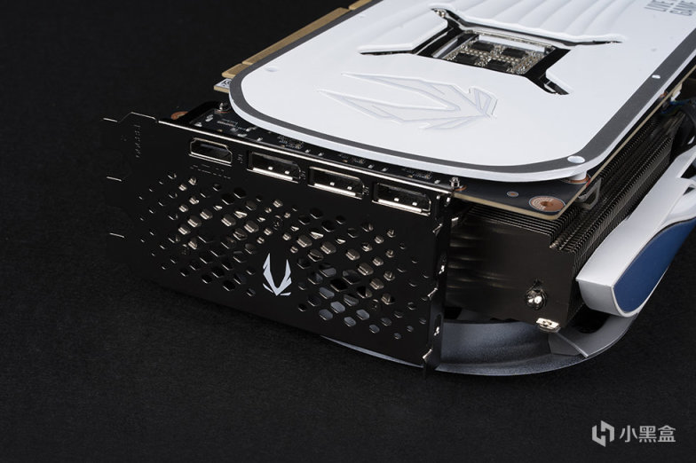 索泰GeForce RTX 4090 AMP EXTREME AIRO显卡尺寸为35.5×16.6×7.2CM,背部为坚固的压铸金属背板,并在末端有大面积镂空设计,辅助显卡散热。除此之外,还在背板GPU处增设了一个金属后固定支架,以提供额外的加固保护。