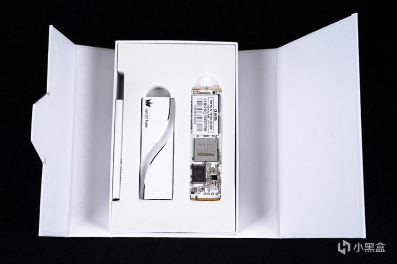 内包装很有仪式感,采用了磁吸式中央对开的方式,打开后可以看到SSD本体和独立的散热马甲。