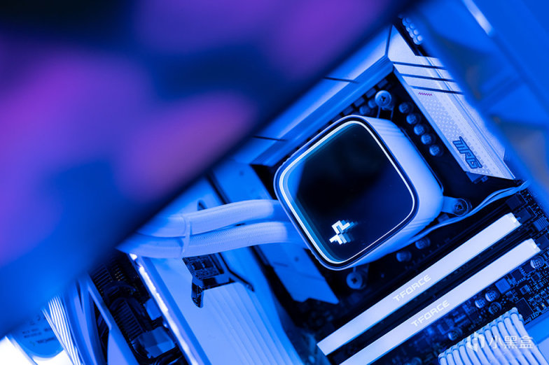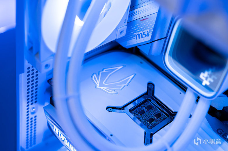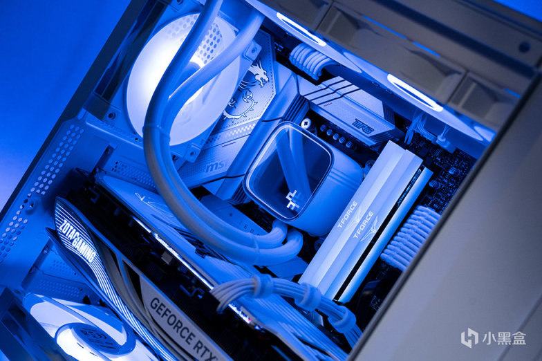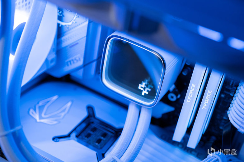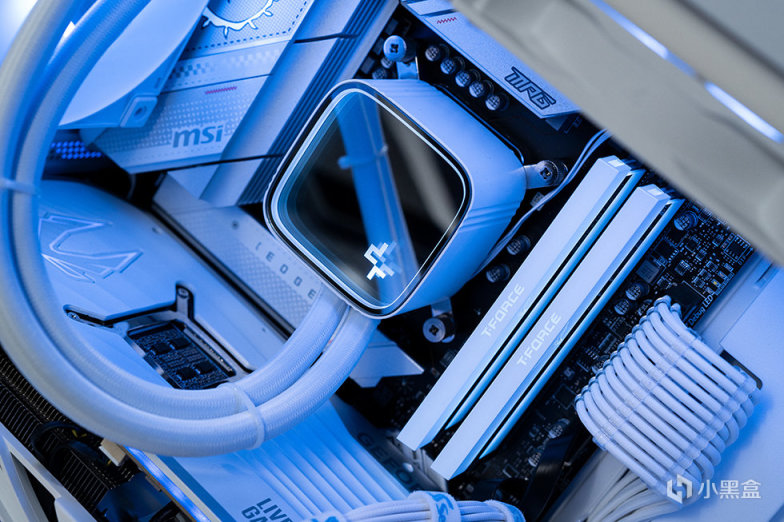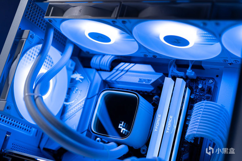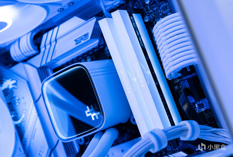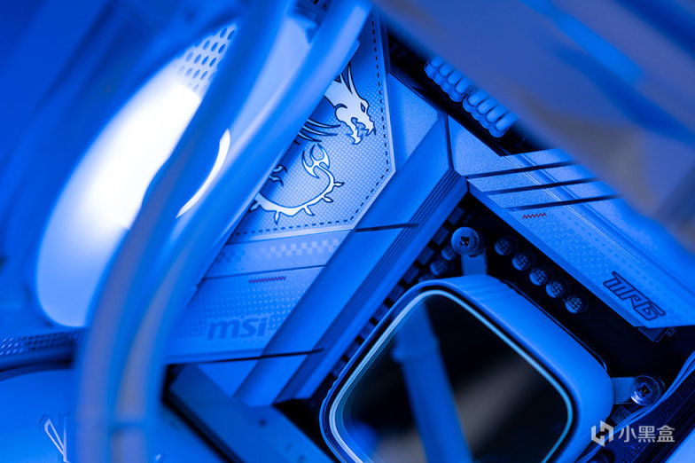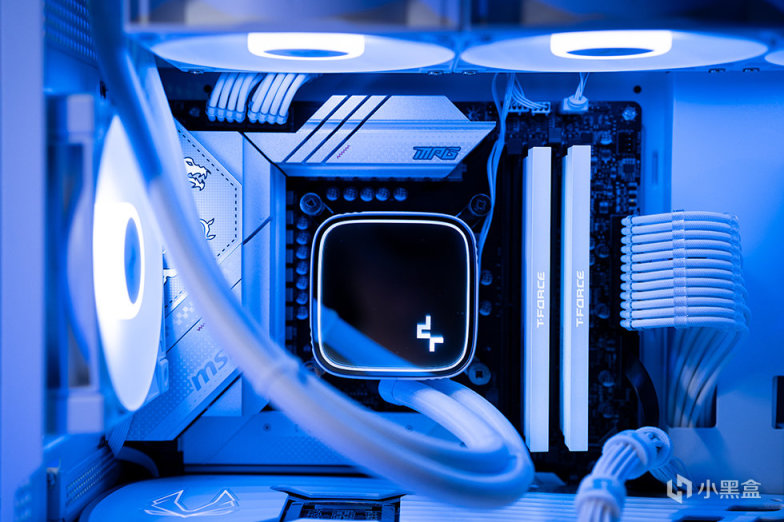 微星 Z790 刀锋钛的银色装甲搭配九州风神冰堡垒青春版的镜面冷头,视觉效果非常不错。