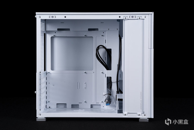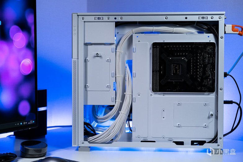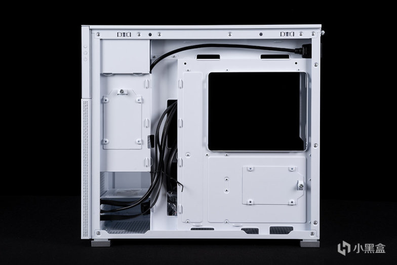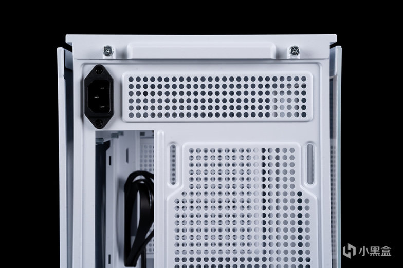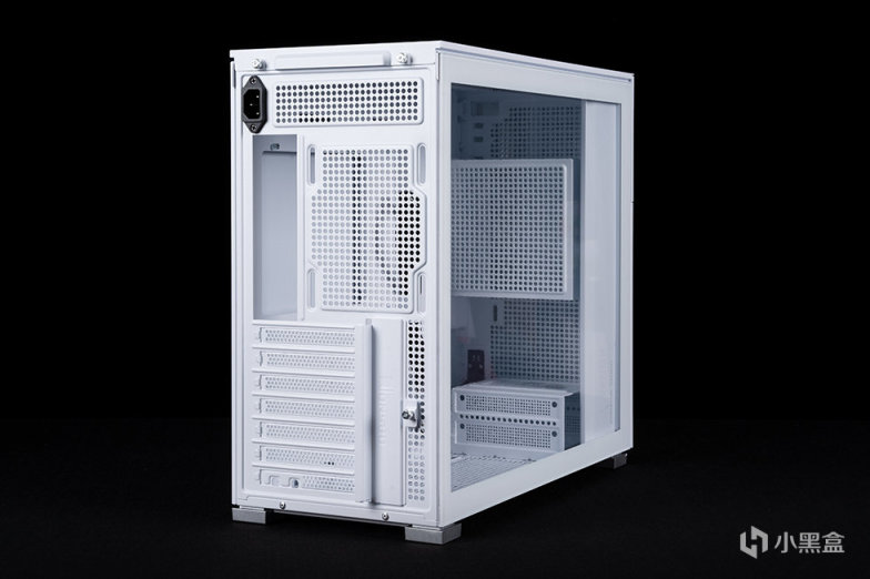 机箱的背面,主板区域采用大面积开放设计,更方便扣具的安装。围绕主板区域,设置了7处过线孔和18个理线桥,同时35mm深度的藏线空间,优化了理线过程。背部左侧和右下角提供了2个2.5寸硬盘安装位。