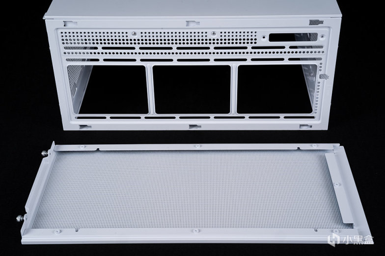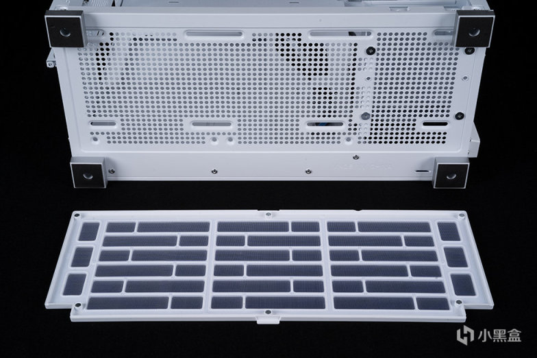 机箱上方也是mesh面板设计,拧掉尾部的2颗螺丝后可以拆除,顶部有冷排及风扇安装位,最大支持360水冷或3*120mm的风扇安装,顶盖个冷排之间留出了12mm的出风气流缓冲区,可有效降低风阻和风噪。机箱底部也是大面积的开孔设计,支持3*120mm的风扇安装,并带有磁吸式尼龙防尘网。