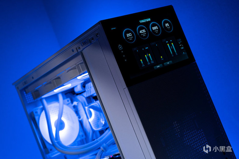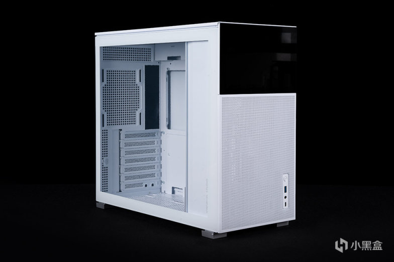 内部结构方面,最大支持ATX板型,支持168mm高CPU风冷散热器,18cm长电源和4槽位、335mm长显卡(4090也没有问题)。垂直短风道设计,内部最多可扩展8颗120mm风扇,顶部最大支持360mm冷排安装。