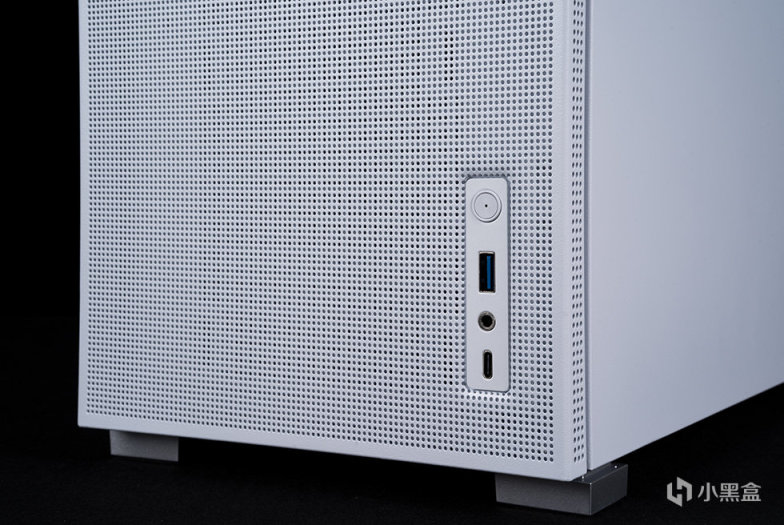 机箱的IO部分设置在正面右下角,从上到下以此为:电源开关,USB3.0 TYPE-A,3.5mm音频,USB-C 3.2 Gen 2(10GBps),属于常规配置。