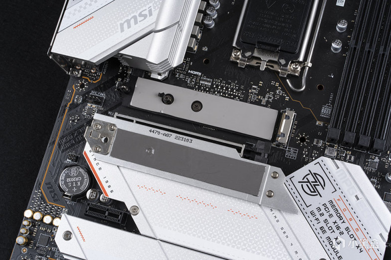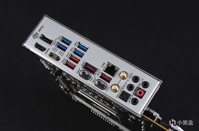 I/O区域微星采用一体式银色涂装挡板,提供DP/HDMI视频接口,4个USB3.2 Gen1 Type A接口,4个USB3.2 Gen2 Type A接口,两个C口一个味USB3.2 Gen2一个为USB3.2 Gen2x2,2.5G有线网口Wi-Fi6E天线接口,音频接口,以及BIOS快捷重置和FlashBIOS按钮。