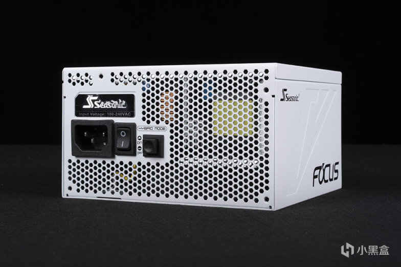 电源的背部是大面积的镂空设计,有助于散热,附有金属LOGO铭牌,下面依次是电源插口、开关和Hybrid MODE开关,支持第三代温控技术,40%负载下风扇启停。