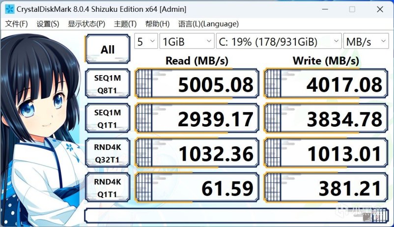 CrystalDiskMark的读写测试均达到被官方标称5000/4000 MB/s速率