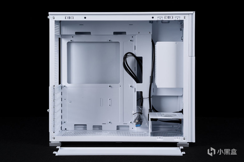 机箱前部电源位带有装饰盖板,拆除后可以看到电源安装位,电源为支持4级高度调节,可根据配置调节电源安装高度。最大支持18cm的电源和335mm长度的三槽显卡,在安装标准14cm的ATX电源时可支持360水冷及335mm的显卡。底部相对D31还增加了一个2盘位的HDD仓。