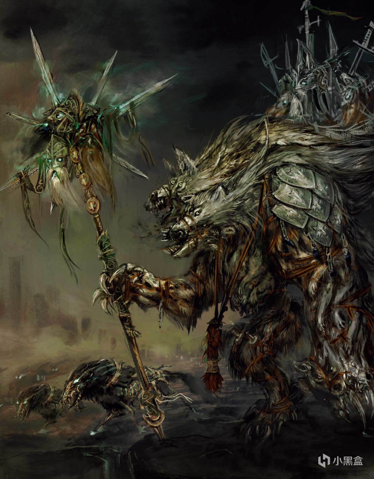 它的眼睛是黄色的,身形半人半狼,全身覆盖着狼皮,这些皮毛是从同类身上剥取的,以粗糙的方式缝合在它的身体上。