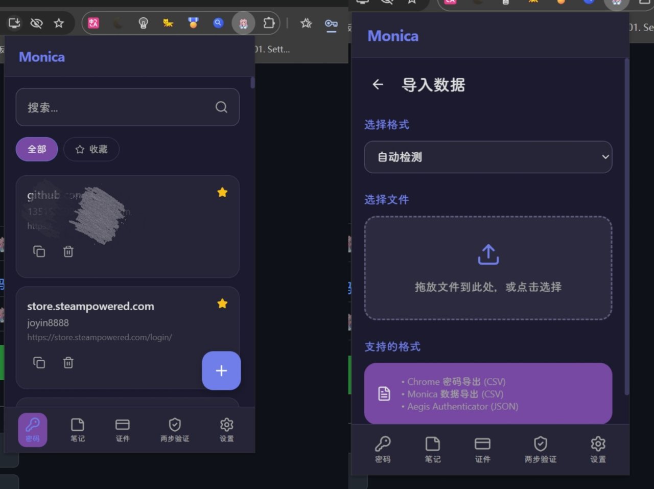 Monica插件版本的一個優勢是可以直接在瀏覽器中進行填充,自動填充密碼,自動填充2fa驗證器(因爲2fa驗證器比較敏感,所以需要輸入密碼)目前來說我已經使用這個代替掉了google的自動填充,只是對於我自己來說比較方便
