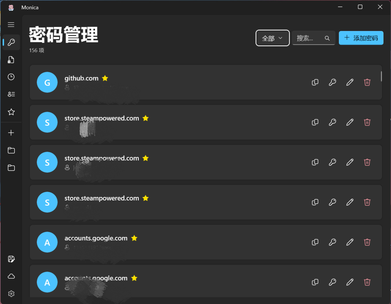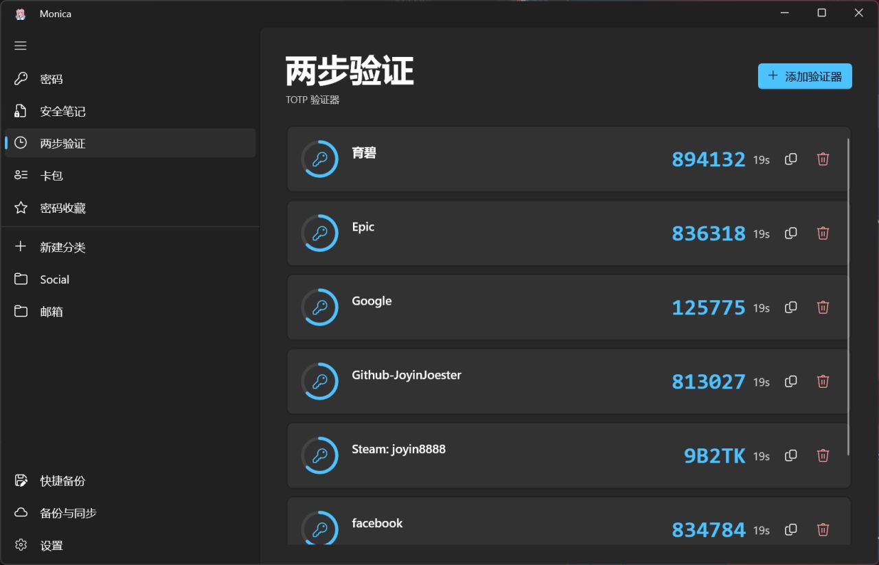 um…首先是我維護時間最長,也是第一個版本,Monica for Android,在我剛開始做的時候有很多盒U給我提建議我也好好學習了一下,主要功能就是密碼存儲,2fa管理器,還可以存儲一些證件信息啥的,安全筆記我一開始覺得沒必要做的,後來想了一下可以存儲一些2fa驗證器的恢復碼什麼的,