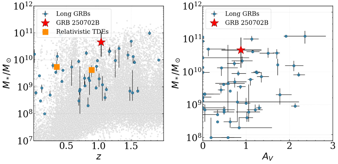 原文图7:展示GRB 250702B宿主星系(红星)的质量与红移,与长伽马射线暴宿主(蓝点)、场星系(灰点)及两个相对论性潮汐瓦解事件宿主(橙方)的对比。右图展示其质量与消光关系,它属于质量较大且消光较强的群体。