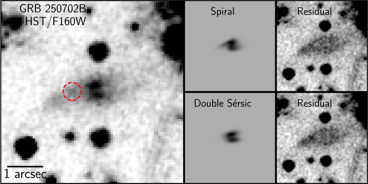 左上为HST在F160W波段拍摄的宿主星系原图,红圈标出余晖位置。其余三图分别为螺旋结构模型、螺旋模型残差、双Sérsic模型、双Sérsic模型残差。残差图中可见弥漫的低表面亮度延伸结构,可能暗示星系处于合并过程中。
