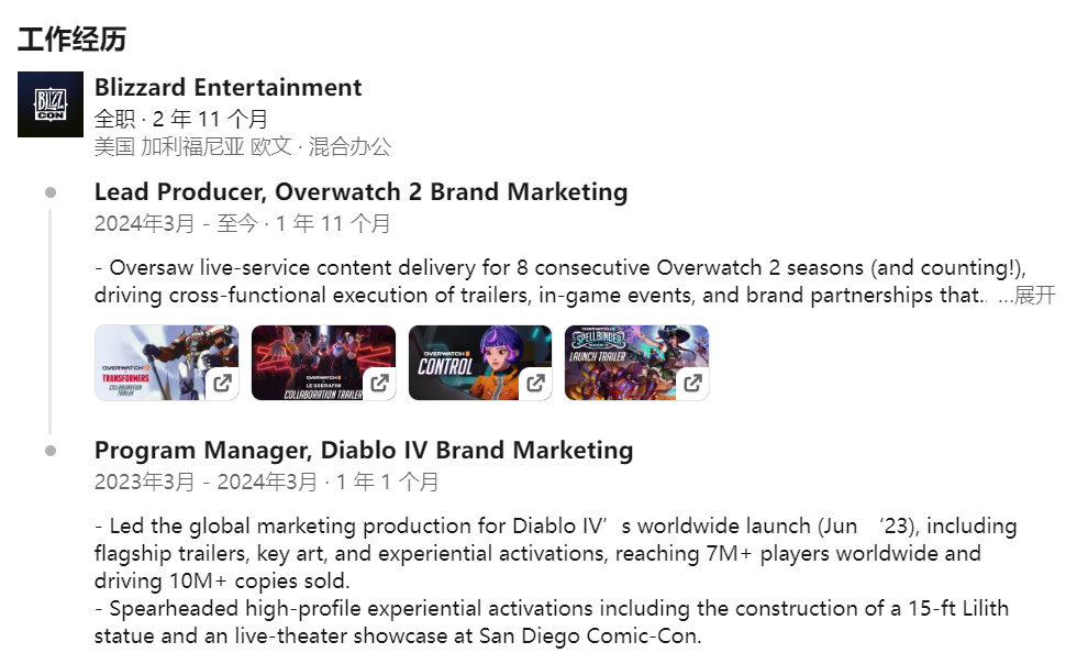 领导《暗黑破坏神4》全球上市(2023年6月)的营销制作,包括主要预告片、核心艺术设计和体验式营销活动,覆盖全球700万以上玩家,推动销量超过1000万份。